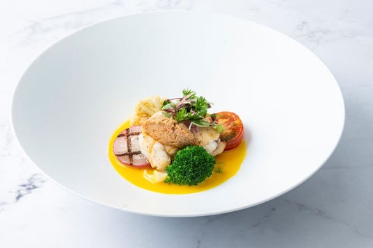 鮟鱇のポワレ 白菜ソテーとクスクス ミモザ色のナージュ仕立て あん肝のコンディマンをアクセントにして