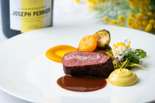 ミモザをイメージした料理は、毎年多くのお客さまに愛されてきた特別なメニューです。なかでも一際想いを込めたのがメインの「国産牛ロース肉のロティ」です。低温でじっくりローストし、香ばしく焼き上げた国産牛に伝統の赤ワインソースを合わせ、奥行きのある味わいを追求しました。このトラディショナルな逸品に、ミモザサラダなどで黄色を添え、華やかに仕上げました。コースの締めくくりには、パティシエが趣向をこらした可憐なデザートをご用意。前菜からデザートまでミモザの世界観を楽しんでいただけるはずです。“感謝”の想いを込めて作り上げたこのディナーが春の訪れを感じるひとときとなれば嬉しいです。