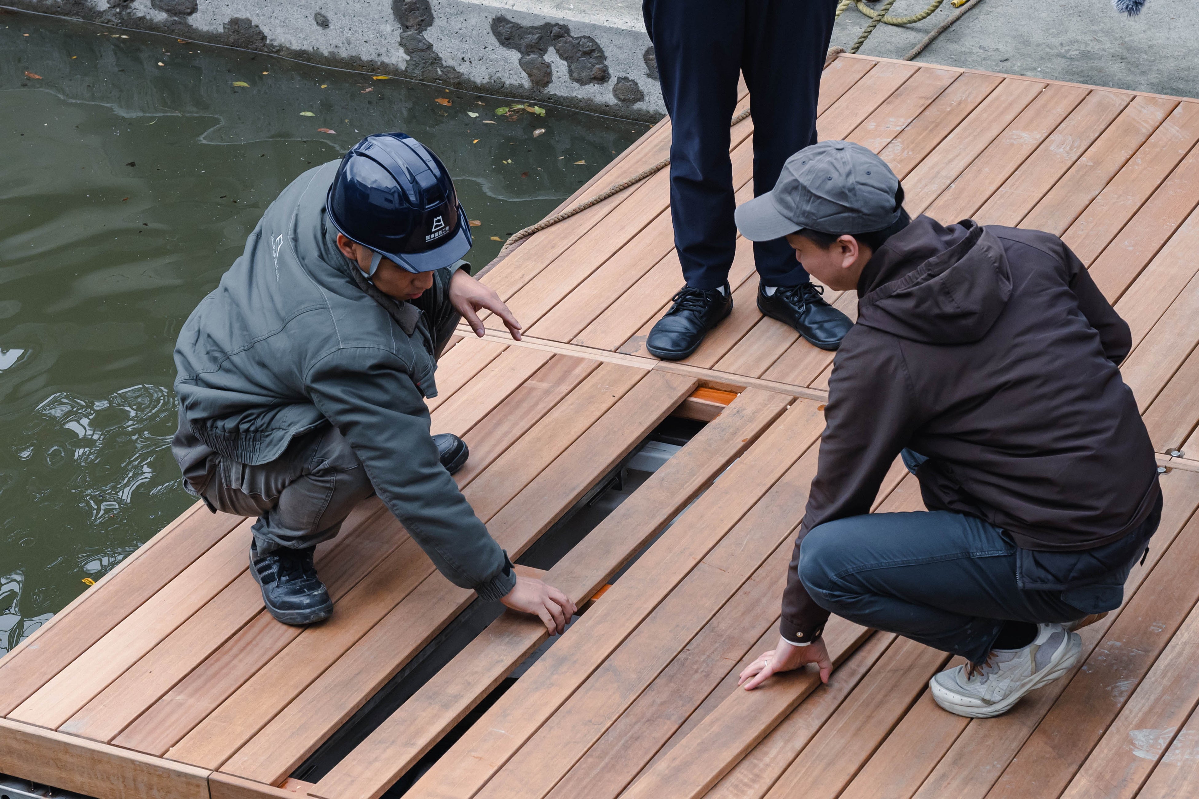 設計と製造を担ったのは、水門メーカーである乗富鉄工所です。錆びにくい鉄素材と連結技術、用途に応じて広さを変えられる構造、柳川特有の狭い橋を通航できる設計など、インフラ技術を応用した水上空間として開発されました。