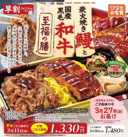 「ワタミの宅食」ではお弁当を通して行事や季節感を楽しんでいただけるよう、毎日お届けする日常商品に対して一線を画す特別弁当を数量限定・月替わりで販売しております。 「炭火焼き鰻と国産黒毛和牛 至福の膳」は予約販売を行い、2026年3月27日(金)にお届けいたします。