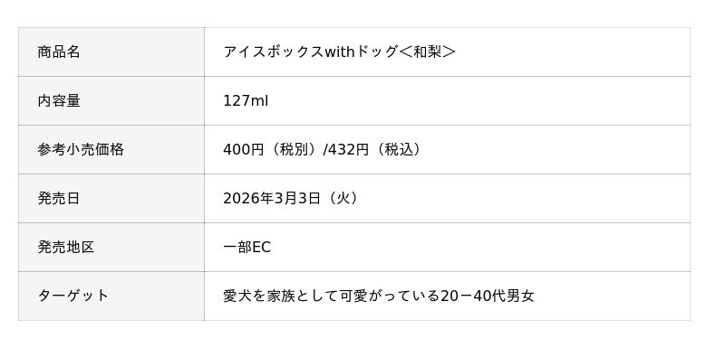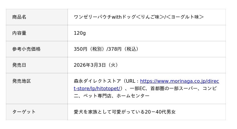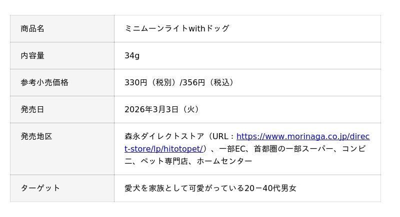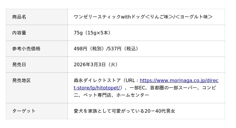 森永製菓株式会社(東京都港区芝浦、代表取締役社長COO・森 信也)は、「ひと」と「ペット」が同じおやつを一緒に楽しむという食体験を提案する「ひととペットプロジェクト」から第一弾の商品として、飼い主と愛犬が一緒に食べることができる「ミニムーンライトwithドッグ」、「ワンゼリースティックwithドッグ<りんご味>」、「ワンゼリースティックwithドッグ<ヨーグルト味>」、「ワンゼリーパウチwithドッグ<りんご味>」、「ワンゼリーパウチwithドッグ<ヨーグルト味>」、「アイスボックスwithドッグ<和梨>」、「冷凍ホットケーキwithドッグ」全7品を、3月3日(火)より一部企業にて、新発売いたします。