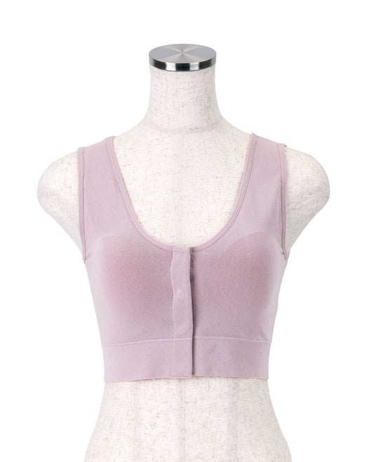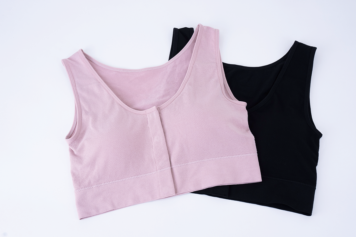 着衣したままでも留め外ししやすいよう、前側にスナップボタンを配置したブラジャーです。ブラジャーや衣服を大きくずらすことなく診察や処置が行え、医療現場でのスムーズな対応もサポートできるよう考慮しました。乳房切除をされない方や術後の回復中、病気やケガ、ご高齢で腕を後ろに回しにくい方、授乳中の方など幅広い需要に対応できる点が特長です。M~LとL~LLの2サイズ展開で、カラーはピンクとブラックの2色からお選びいただけます。