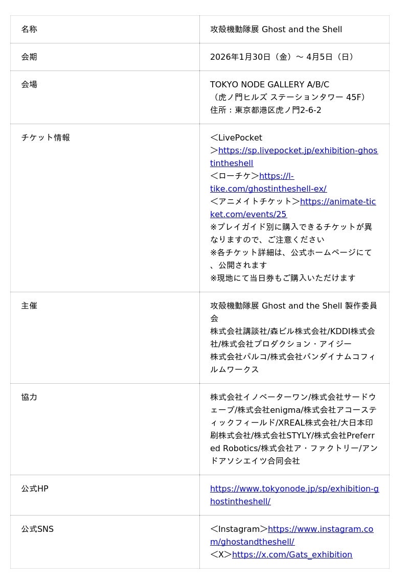 攻殻機動隊展 Ghost and the Shell 製作委員会(株式会社講談社、森ビル株式会社、KDDI株式会社、株式会社プロダクション・アイジー、株式会社パルコ、株式会社バンダイナムコフィルムワークス)は、2026年1月30日(金)から4月5日(日)まで、虎ノ門ヒルズの情報発信拠点「TOKYO NODE(東京ノード)」にて『攻殻機動隊展 Ghost and the Shell』(以下、本展)を開催しております。