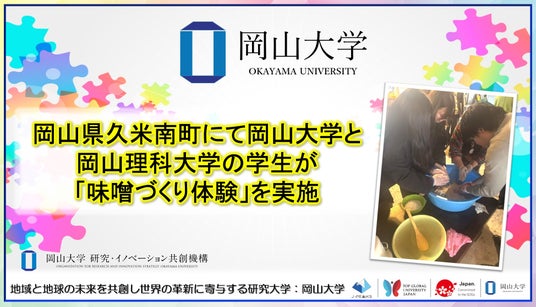 国立大学法人岡山大学(本部:岡山市北区、学長:那須保友)の研究・イノベーション共創機構は、2026年1月15日、内閣府の地域中核大学イノベーション創出環境強化事業の一環として、岡山県久米南町と連携し、町内の古民家を改修した「里方屋」において、地域住民と学生が協働する味噌づくり体験プログラムを実施しました。本プログラムには、本学学生に加え、岡山理科大学の学生も参加しました。