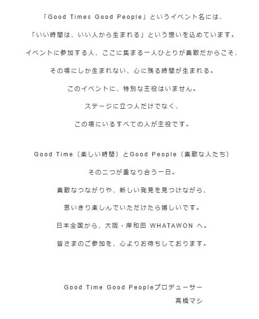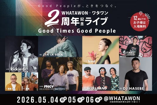 大阪・岸和田の滞在型エンターテインメントモールWHATAWON(ワタワン)は、開業2周年を記念し、3日間にわたるスペシャルフェス「Good Times Good People」を開催いたします。