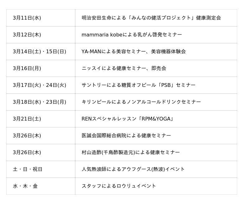また、開業1周年を記念して人気インストラクターによる特別レッスンや提携医療機関による健康セミナー、サウナでの熱波イベント、美容機器体験会など多彩なイベントを開催いたします。各イベントは入館料から追加料金なくご参加いただくことが可能です。これまでのご愛顧に感謝し、いつ訪れても楽しく、健康やウェルビーイングな生活のための気付きを得られる企画をご用意しております。