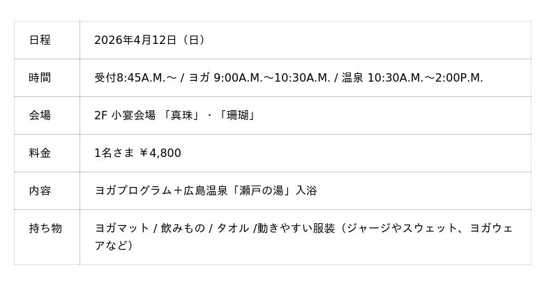本イベントでは、ホテル2階の小宴会場にて、瀬戸内海を眺めながらヨガプログラムを体験いただきます。プロの講師が、初心者でも安心してご参加いただける優しいポーズをレクチャー。凝り固まった心身のリセットを目指します。ヨガプログラム後には、広島市内のホテルでは珍しい天然温泉、広島温泉「瀬戸の湯」への入浴をお楽しみいただけます。
