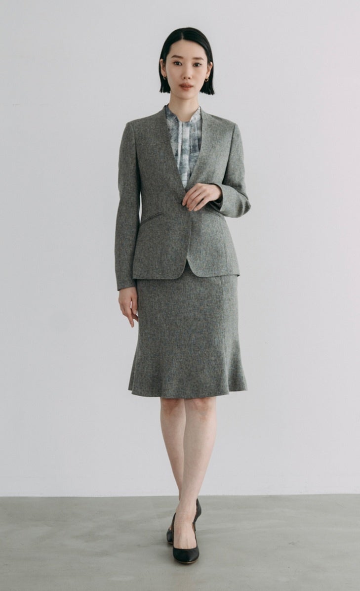 霜降り調の表面感が表情豊かなツイル生地。ノーカラージャケットとマーメイドスカートでメリハリのあるエレガントな装いが叶います。モノトーンで品よくまとめ、洗練されたムードに。