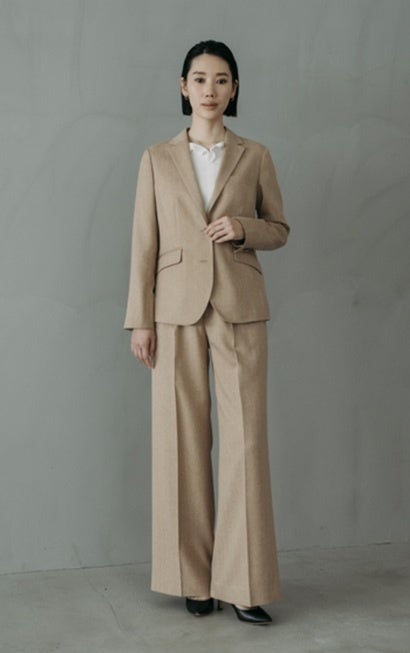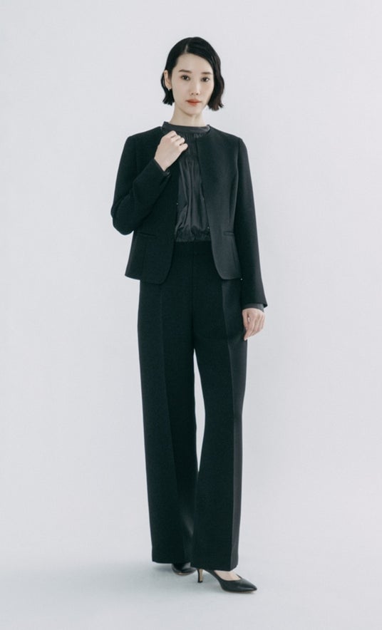 光沢を抑えたドライな質感を持つ二重織素材。コンパクトな着丈のノーカラージャケットにワイドパンツを合わせ、ブラックのスーツを品良くモードな印象にアップデート。