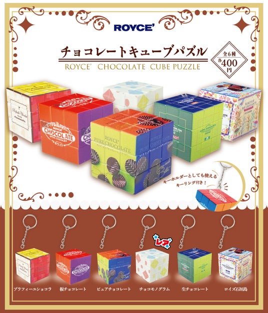 ▼チョコレートキューブパズルロイズの人気商品のパッケージをデザインした、手のひらサイズのキューブパズル。キーホルダーとしても使えるキーリング付きです。