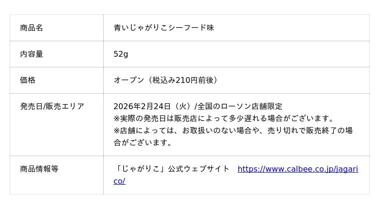 カルビー株式会社(本社:東京都千代田区、代表取締役社長兼CEO:江原 信)は、独自の製法で“はじめカリッとあとからサクサク”の心地よい食感が楽しめる「じゃがりこ」ブランドより、青い海の幸の味わいをイメージした『青いじゃがりこシーフード味』を2026年2月24日(火)から全国のローソン店舗で数量限定発売します(なくなり次第、終了)。※製品の青い色は、クチナシ色素由来です。