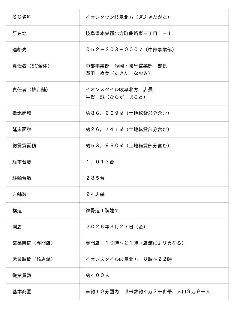 イオンタウン株式会社(本社:千葉県千葉市美浜区、代表取締役社長:加藤久誠)は、3月27日(金)岐阜県本巣郡北方町にショッピングセンター「イオンタウン岐阜北方」(以下:当SC)をグランドオープンいたします。