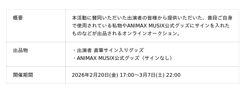 オークションの売上は、クリエイター支援のため2026年開催予定のANIMAX MUSIX NEXTAGE運営費およびNPO法人アニメーター支援機構への寄付に充てさせていただきます。