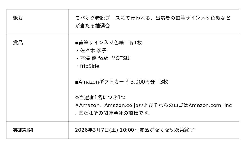 また、イベント当日の会場限定企画として、出演直後のアーティストに会える「アフタートーク抽選会」や出演者の直筆サイン入り色紙が当たる「モバオク特設ブース抽選会」も実施いたします。
