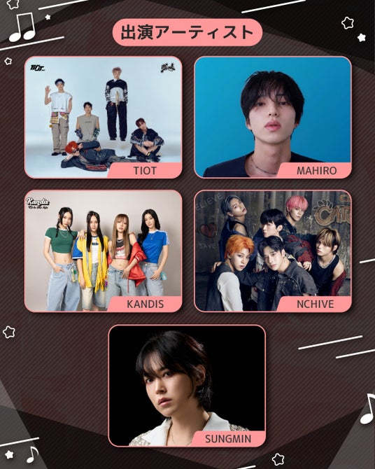 2025年1月のデビュー以来、音楽番組で披露した圧倒的なパフォーマンスが話題となり、SNSでも「新人離れした生歌」として注目を集めるガールズグループ Kandis が出演。さらに、K-POP第5世代を代表するボーイズグループ TIOT、NCHIVE も登場し、次世代K-POPシーンを牽引するパフォーマンスを披露します。