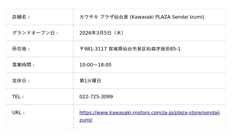 カワサキモータースジャパンの正規取扱店として、2026年3月5日(木)、宮城県仙台市泉区に「カワサキ プラザ仙台泉」をグランドオープンいたします。