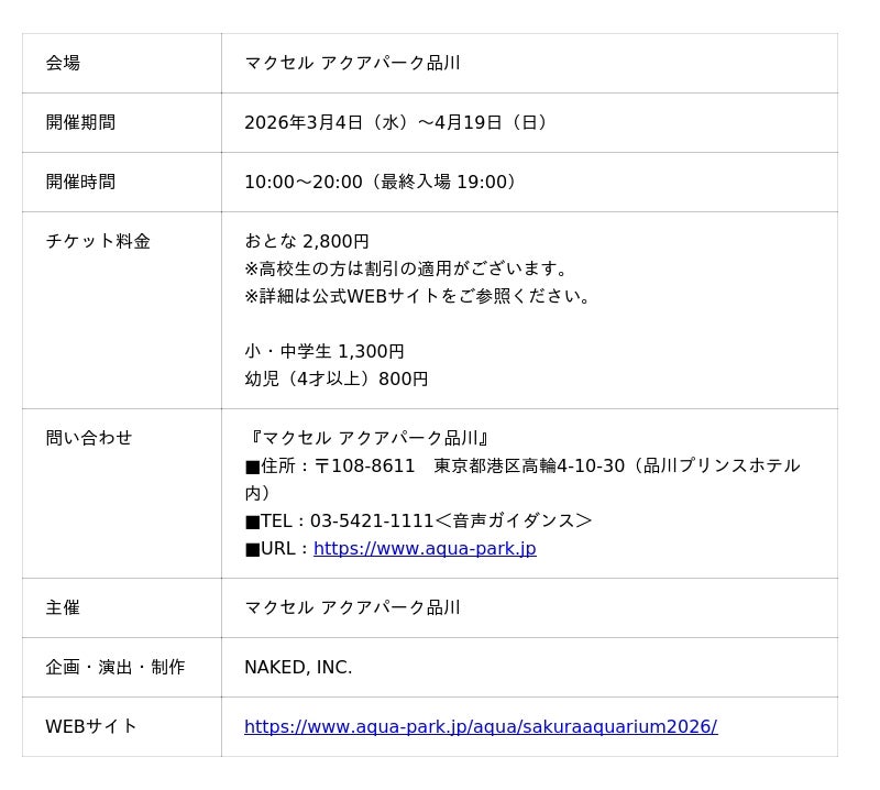 株式会社ネイキッド(英語表記:NAKED, INC. 、所在地:東京都渋谷区、代表:村松亮太郎)は、2026年3月4日(水)~4月19日(日)までの期間、マクセル アクアパーク品川にて、春季限定イベント『SAKURA AQUARIUM by NAKED』の企画・演出・制作を手がけています。