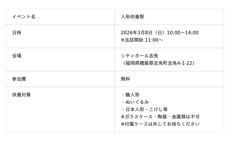 本催しは、長年大切にしてきた人形を安心して供養したいという地域の声にお応えして開催するもので、日本人形・ひな人形・ぬいぐるみなどを対象に供養を行います。参加費は無料で、どなたでもご参加いただけます。