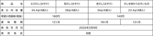 株式会社 永谷園(社長:掛谷 浩志、東京都港区)は、1967年の発売以来、59年の長きにわたりご愛顧いただいている、フリーズドライ粉末タイプみそ汁「赤だし」をリニューアルするとともに、だしを味わう汁物”シリーズとして「えびだし」「貝だし」「だしを味わうおすいもの」を2026年3月9日(月)より全国で新発売いたします(希望小売価格:えびだし・貝だしは税抜180円、赤だし・だしを味わうおすいものは税抜140円) 。