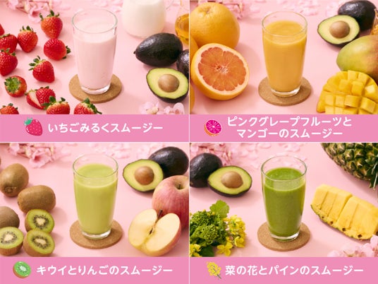 昨年春に好評を博した「ストロベリーソイスムージー」にも使用した「いちご」をはじめ、「ピンクグレープフルーツ」「キウイ」「菜の花」などのフルーツや野菜を豊富に使ったスムージーは美味しさを楽しみながら、健康も美容にも嬉しい一杯となっています。