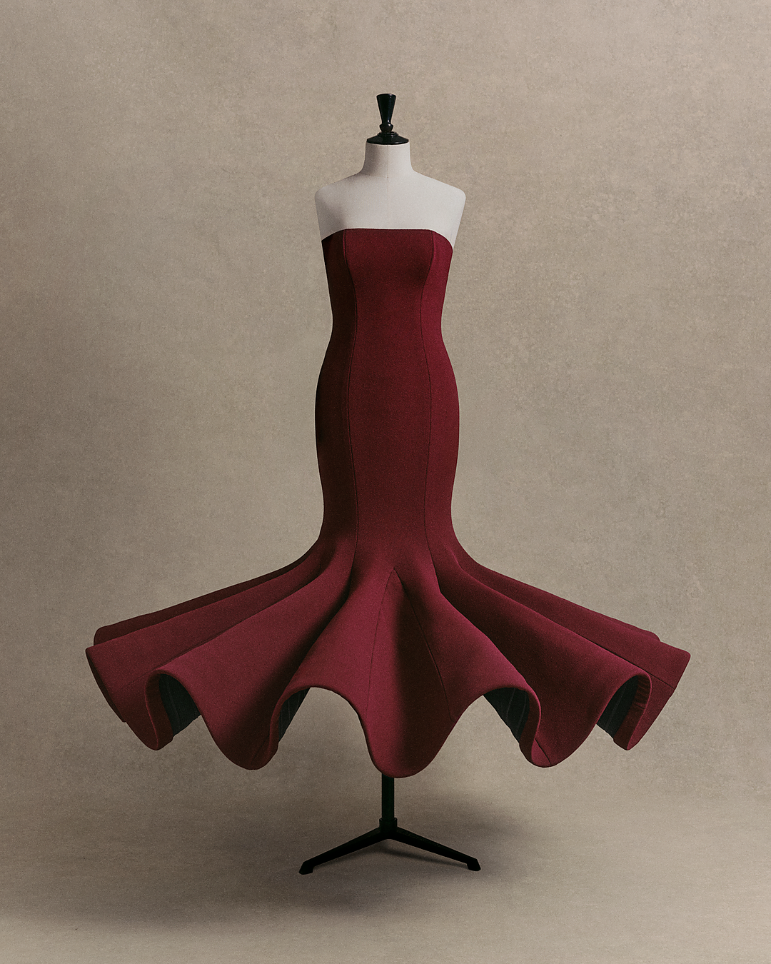 バーガンディカラーのビスチェドレスのシルエットは、ビスチェとクリノリンを基盤にデザインされており、波打つフラワーの形をした印象的なヘムラインを形作っています。