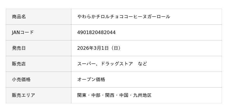 敷島製パン株式会社(Pasco)は、「やわらかチロルチョココーヒーヌガーロール」を2026年3月1日(日)より*、関東・中部・関西・中国・九州地区にて発売します。
