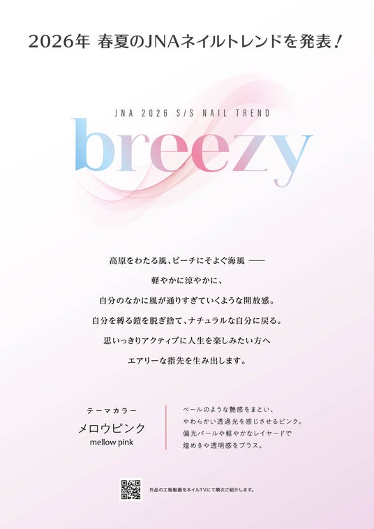 NPO法人日本ネイリスト協会(略称:JNA、所在地:東京都千代田区、理事長:仲宗根幸子)は、2026年春夏のネイルトレンドのテーマを「breezy」とし、このテーマを表現する作品を発表します。