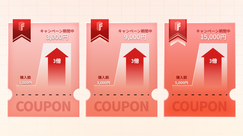 早期限定クーポンが3倍に膨らむ早期限定クーポンを事前にご購入いただくことで、対象期間中にクーポン金額が3倍に増額され、商品購入時にご利用いただけます。クーポンは1,000円分/3,000円分/5,000円分の3種類をご用意しており、対象期間中はそれぞれ3,000円分/9,000円分/15,000円分としてご利用可能です。(※最低利用金額はクーポンごとに異なります。詳細はキャンペーンページをご確認ください。)