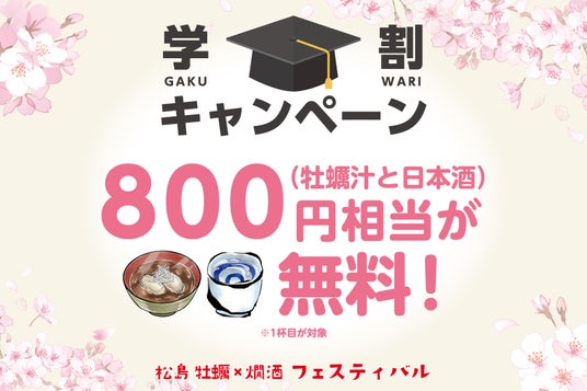 20歳以上の学生の方は、特製牡蠣汁と日本酒1杯が無料(合計800円相当)でお楽しみいただけます。ご卒業旅行やお友達との小旅行で、ぜひこのお得な機会に旬の牡蠣と宮城の日本酒をご堪能ください。