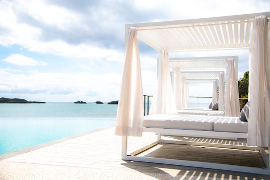 ラグーンから海へのインフィニティビューを真っ白な天蓋付きのビーチベッドでお楽しみいただけるプライベートカバナも事前予約にてご利用いただけます。波音に耳を傾けながら、空と海がどこまでも広がる絶景を心ゆくまでお楽しみください。