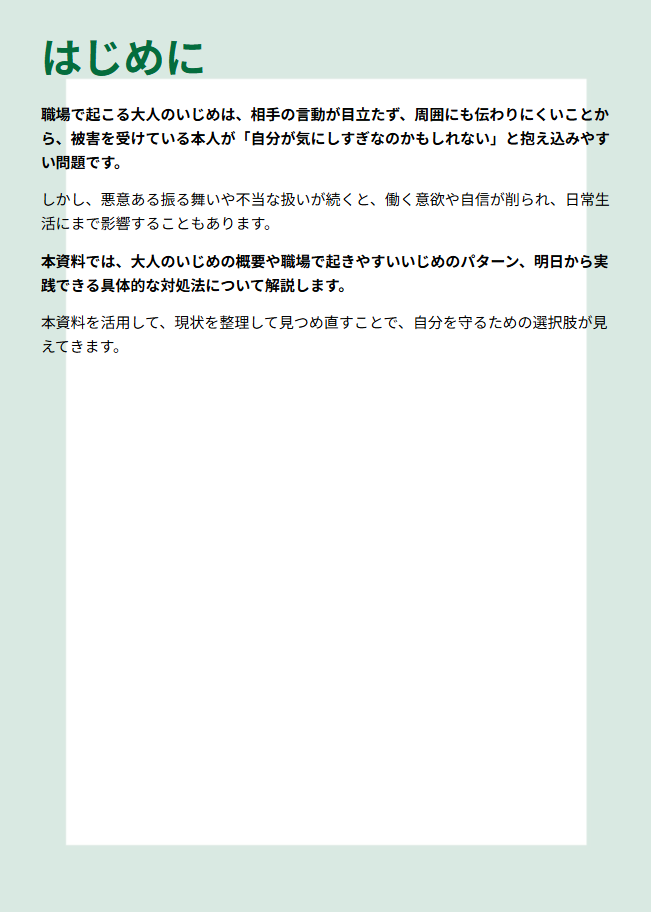 本資料では、大人のいじめの実態や具体的な対処ステップについてわかりやすく解説しています。