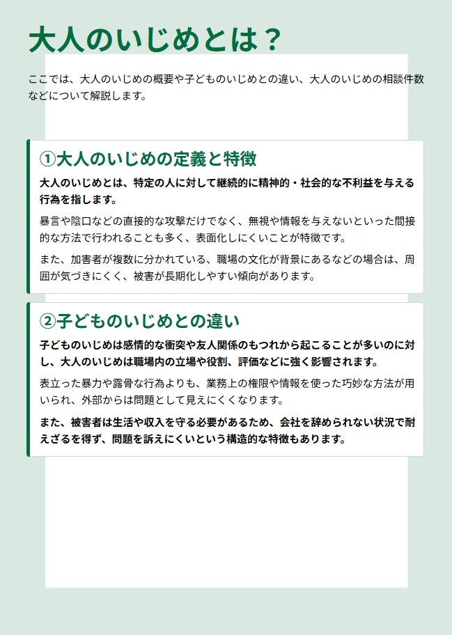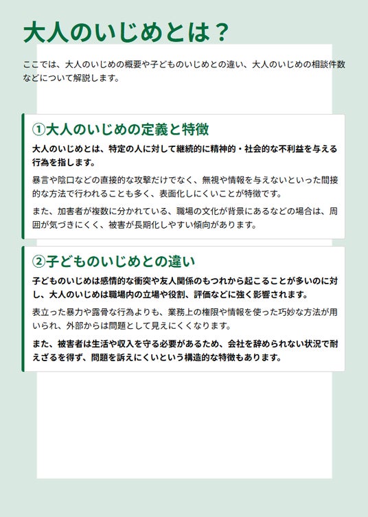 また、大人のいじめの概要やパターン、種類、原因、影響、対処法について解説したコラムを公開しています。