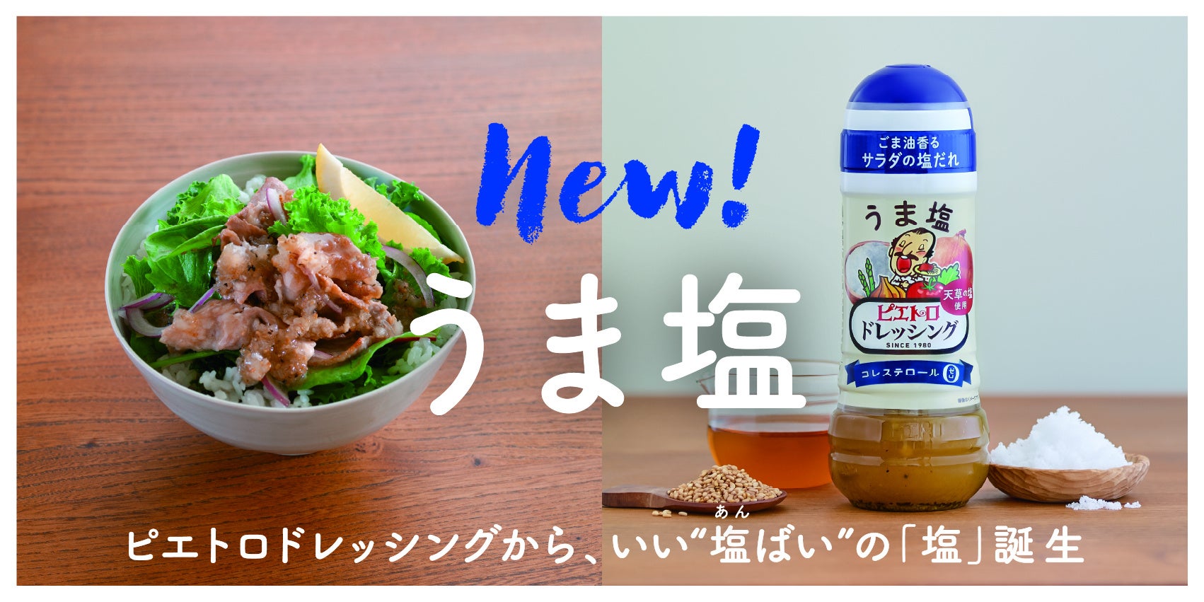 会社ピエトロ(本社:福岡市中央区、代表取締役社長 高橋 泰行)は、3月1日(日)より、主力定番ドレッシングとしては9年ぶりの新フレーバーとなる「ピエトロドレッシング うま塩」を発売します。熊本県産のブランド銘柄『天草の塩』を使用した、うま味の強さとまろやかさが特長の、すっきりと上品な味わいのオイル入り塩ドレッシングです。和風ドレッシングでNo.1(※1)のピエトロが、「塩ドレッシング・塩だれ」市場に参入し、同市場を活性化させると共に、オイル入り塩ドレッシング市場での安定的なトップシェアを目指します。素材本来の味を引き立てる“塩”の使い方にこだわり、サラダはもちろん、塩だれとして様々なお料理にも手軽にご利用いただける商品です。