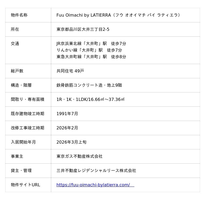 東京ガス不動産株式会社(社長:佐藤 裕史、以下「東京ガス不動産」)は、このたび、共用施設付賃貸レジデンス「Fuu Oimachi by LATIERRA」(以下「本物件」)が竣工したことをお知らせいたします。
