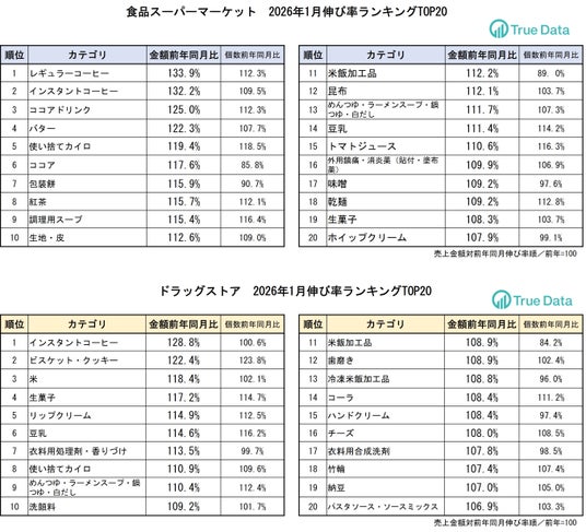 データをもとに企業の意思決定を支援する株式会社True Data(トゥルーデータ/本社:東京都港区、代表取締役社長:米倉 裕之、証券コード4416)は、当社の統計データをもとに、ドラッグストア、食品スーパーマーケットにおける2026年1月の売り上げ伸長カテゴリを発表します。