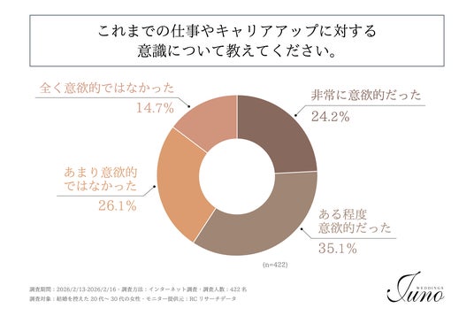 結婚を控えた20代~30代の女性の約6割が、これまでの仕事やキャリアアップに対して意欲的だった