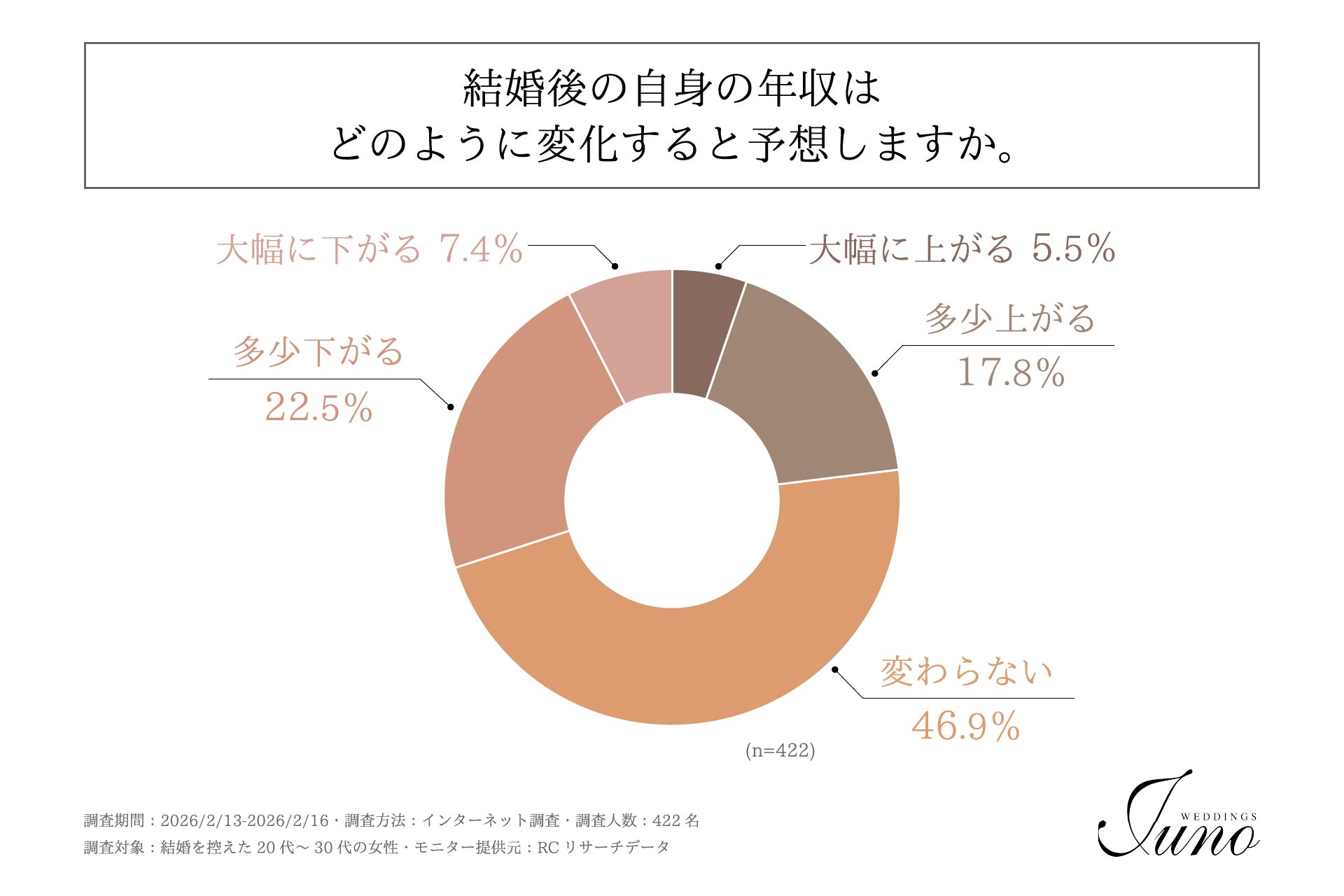 3月8日の「国際女性デー」を前に、女性の生き方やキャリア形成における多様性が改めて注目されています。しかし、配偶者の転勤や家事育児負担の偏りなど、個人の努力だけでは解決できない要因により、結婚がキャリアの制限となってしまうリスクは今なお解消されていないものと思われます。これから新たな門出を迎える女性たちは、自身のこれまでのキャリアをどう評価し、将来に対してどのような予測や葛藤を抱いているのでしょうか。そこで、「ウェディングドレスショップJUNO」は、結婚を控えた20代~30代の女性を対象に、その本音を明らかにするための意識調査を実施しました。