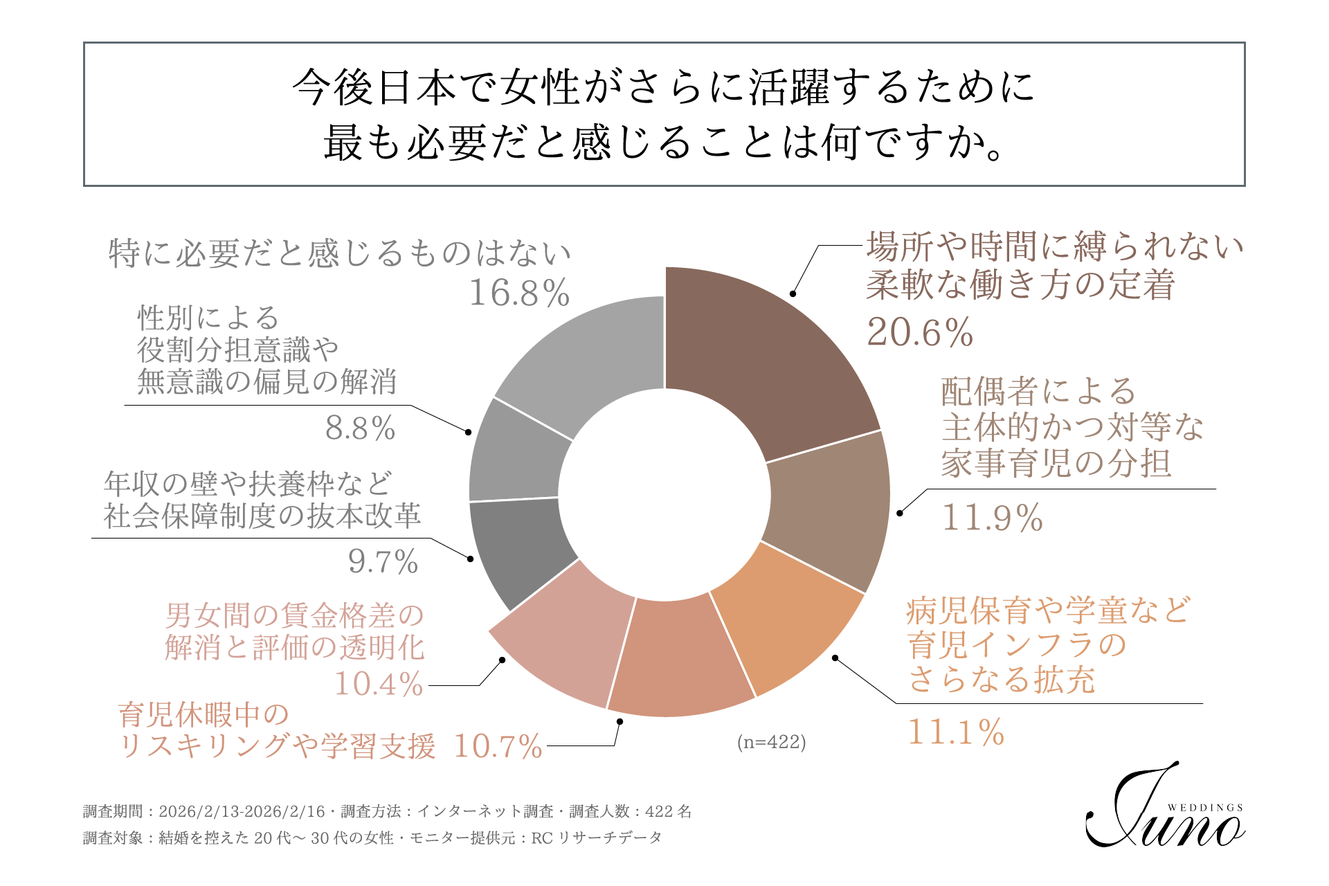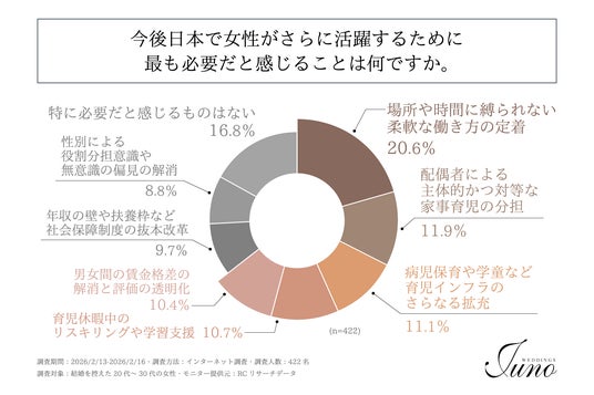 調査の最後、結婚を控えた20代~30代の女性を対象に「今後日本で女性がさらに活躍するために最も必要だと感じることは何か」を尋ねる設問への回答では、1位が「場所や時間に縛られない柔軟な働き方の定着」で20.6%、2位が「特に必要だと感じるものはない」で16.8%、3位が「配偶者による主体的かつ対等な家事育児の分担」で11.9%という結果になりました。この結果から、結婚を控えた20代~30代の女性が今後の日本における女性のさらなる活躍のために最も必要だと感じることは、「場所や時間に縛られない柔軟な働き方の定着」であることがわかりました。