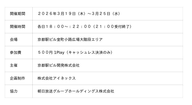 京都駅ビル開発株式会社は、株式会社アイネックスの企画制作、朝日放送グループホールディングス株式会社の協力により、京都駅ビルの大階段を舞台にした体験型イベント「KYOTO DAIKAIDAN TETRIS」を開催します。