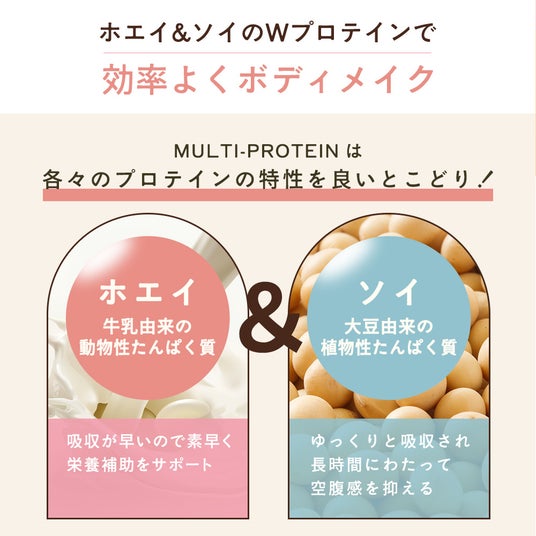 吸収スピードの異なるホエイとソイをバランスよく配合。2つのプロテインの特性を良いとこどりしたWプロテインで、より効率良くボディメイクができます。