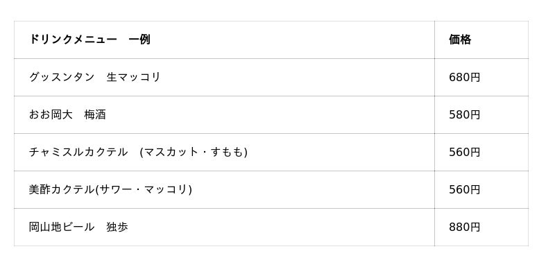 お酒は生マッコリをボトルとグラスで提供します。また、チャミスルをベースにしたカクテルなど女性にも親しみやすいラインナップにしています。更に、岡山の地ビール「独歩」や梅酒「おお岡大」も取り揃えています。