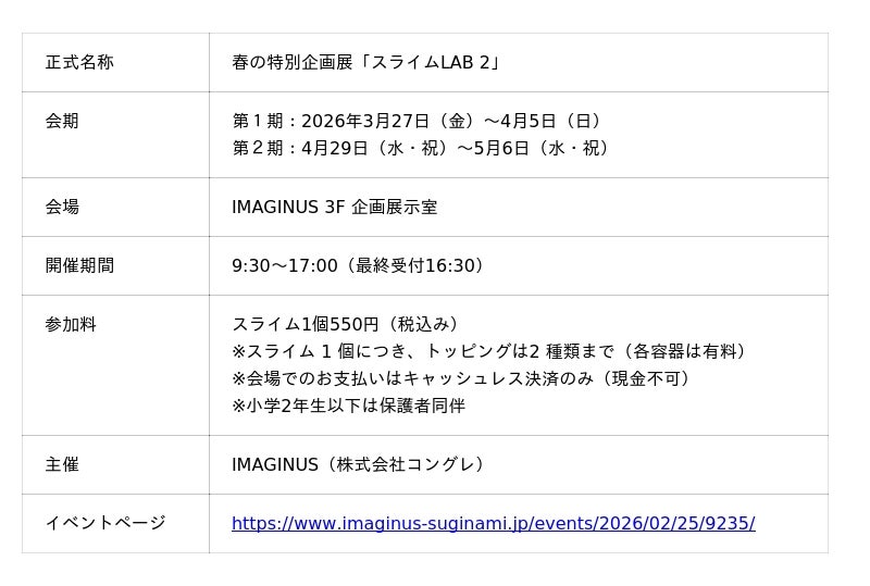 株式会社コングレ(東京本社:中央区日本橋、代表取締役社長 武内 紀子、以下コングレ)が運営する、杉並第四小学校の跡地を活用した「未来をつくる杉並サイエンスラボ IMAGINUS(イマジナス、以下IMAGINUS)」は、2026年春休みの3月27日(金)~4月5日(日)また、ゴールデンウィークの4月29日(水・祝)~5月6日(水・祝)に春の特別企画展「スライムLAB 2」を開催します。昨年大好評を博したスライム展ですが、スライムをつくって遊ぶだけでなく、とことん研究できる仕掛けもパワーアップ。また、カフェの「コラボメニュー」も、ぜひご家族やご友人とお楽しみください。