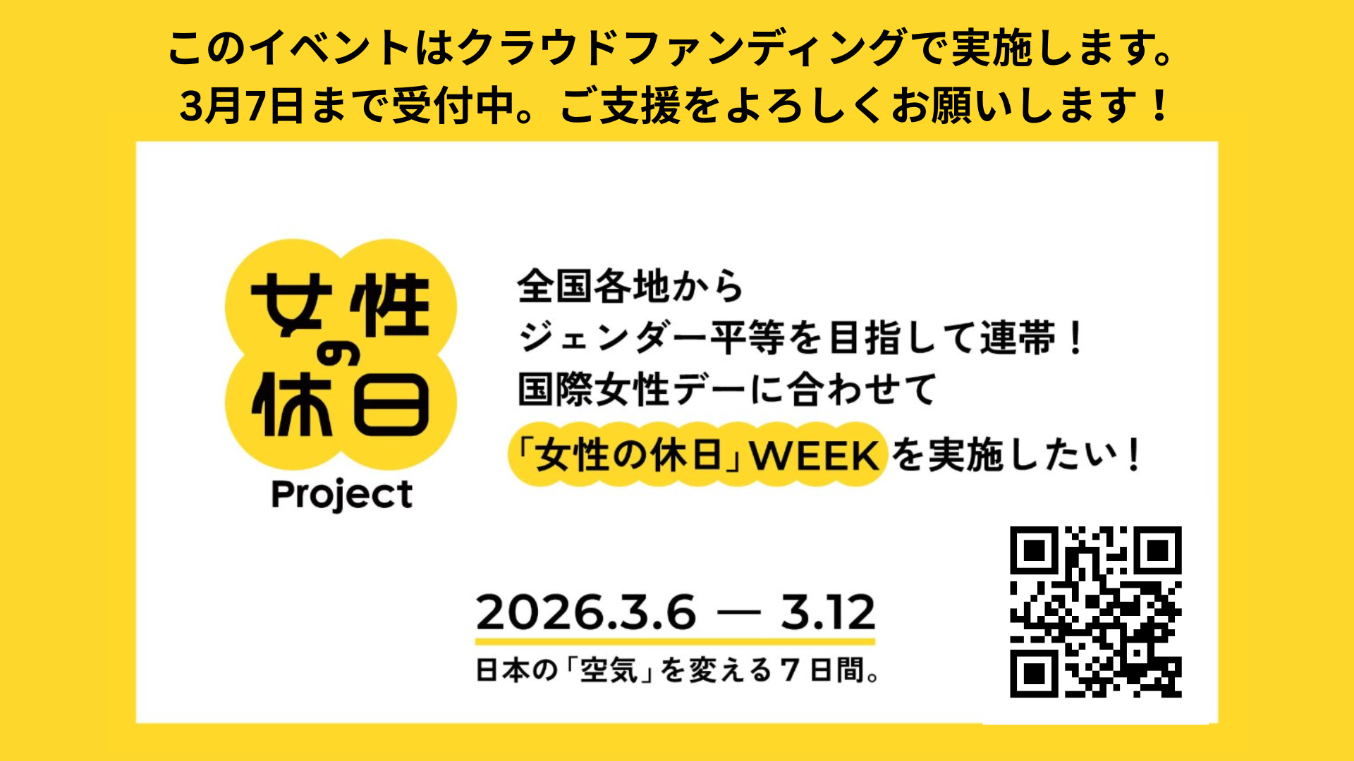 【3/7まで】クラウドファンディング実施中。応援よろしくお願いします!この「女性の休日」WEEKは、全国の法人・個人サポーターの皆様のご支援で実施いたします。クラウドファンディングは3月7日まで募集中。