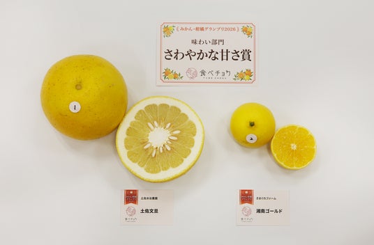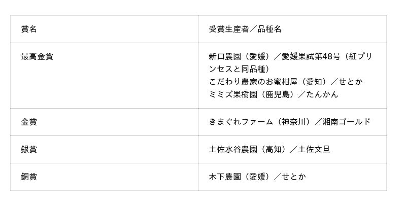 また、金賞にはきまぐれファーム(神奈川県)の「湘南ゴールド」、銀賞には土佐水谷農園(高知県)の「土佐文旦」、銅賞には木下農園(愛媛県)の「せとか」が選出。柑橘王国として知られる愛媛・和歌山・静岡のみならず、これまで柑橘のイメージが強くなかった地域からも高評価が相次ぎ、日本各地に高水準の柑橘生産者が存在することが改めて示されました。