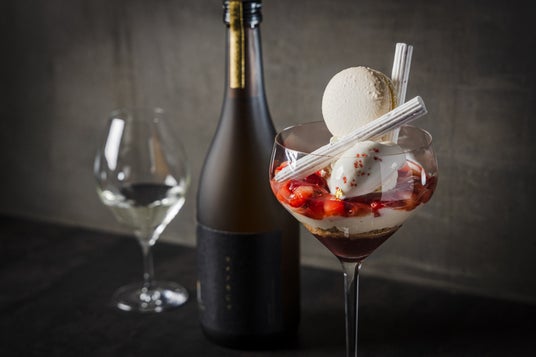 完全会員制パフェバー「Remake easy」、3月限定「桜と日本酒"コメノカジツ"の酒粕マカロンパフェ」が登場、北海道産酒米「きたしずく」から生まれた限定日本酒と苺が重なる春の一杯。