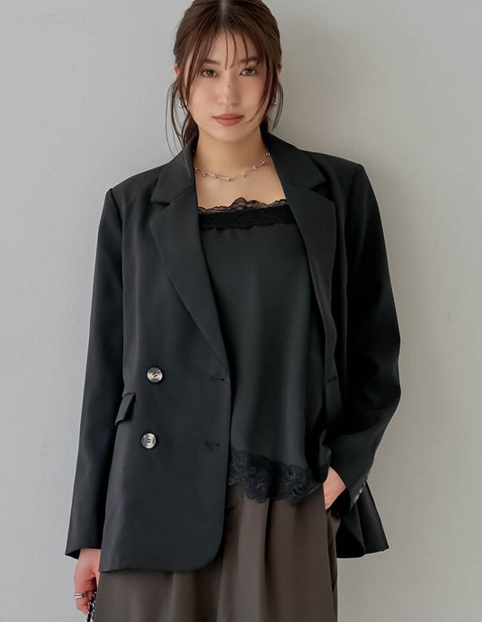 黒ジャケットと深みのあるブラウンで、知的なムードを加速。インナーに繊細なレースを忍ばせることで、重たい印象を払拭し華やかさをプラス。