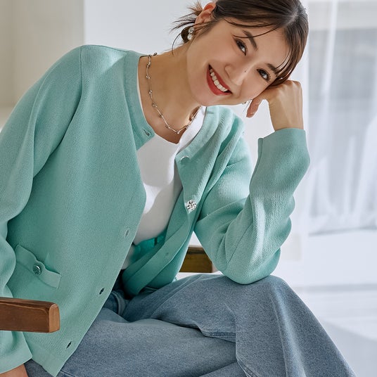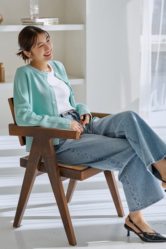 いつものデニムも、ミントグリーンのカーデを合わせるだけで一気に春の表情。