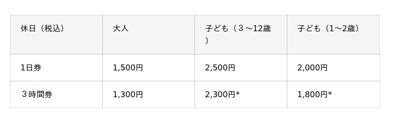 [団体割引]子ども15名以上の利用は団体扱い。子ども(3~12歳)1,700円、子ども(1~2歳)1,200円。貸切利用も可能です
