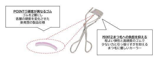 7739652号)しました。上側のやわらかゴムがまつげを優しくカール、下側の硬めゴムがストッパーと