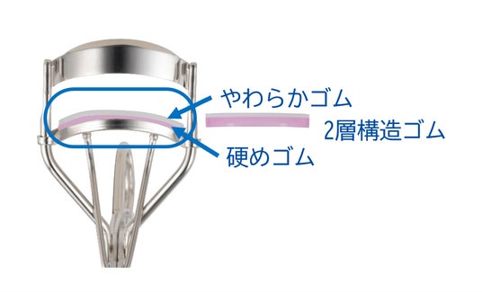 厚さの異なるやわらかゴムと硬めゴムの「2層構造ゴム」がまつげを優しくピタッと守る構造